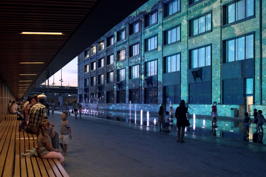 Lighting design of the rehabilitation of the Roshen confectionery factory, a true institution in Eastern Europe. Fountain works, ice rink and permanent video projections on facades transform this factory into an attractive and playful public square. We design lighting, mapping and sound systems (together with Peutz and The Space Factory), in close interface with the fountain designer Philippe Carton. The project also includes an ice-rink that is transformed in summer into a greenery theatre. Here again the light adapts to events, etc. We also assume the artistic direction of the mappings (form and content) and coordinate the musical composition with the musician and composer Yi-Ping Yang.