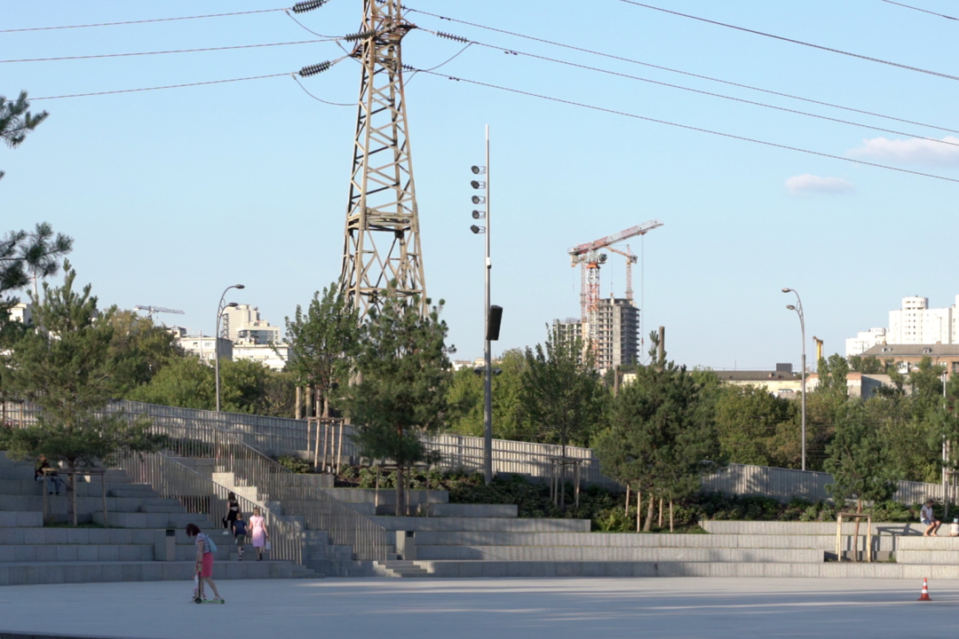 The rink is lit from six large poles equipped with LED spotlights. It can be coloured by the lighting, or covered with light patterns; these effects can be controlled by DMX - zoom, colour, intensity, etc. Underneath, spotlights illuminate the surrounding terraces in warm white. This lighting is fixed (no dynamic effects), but can be controlled via DMX (e.g. when a film or concert starts).
