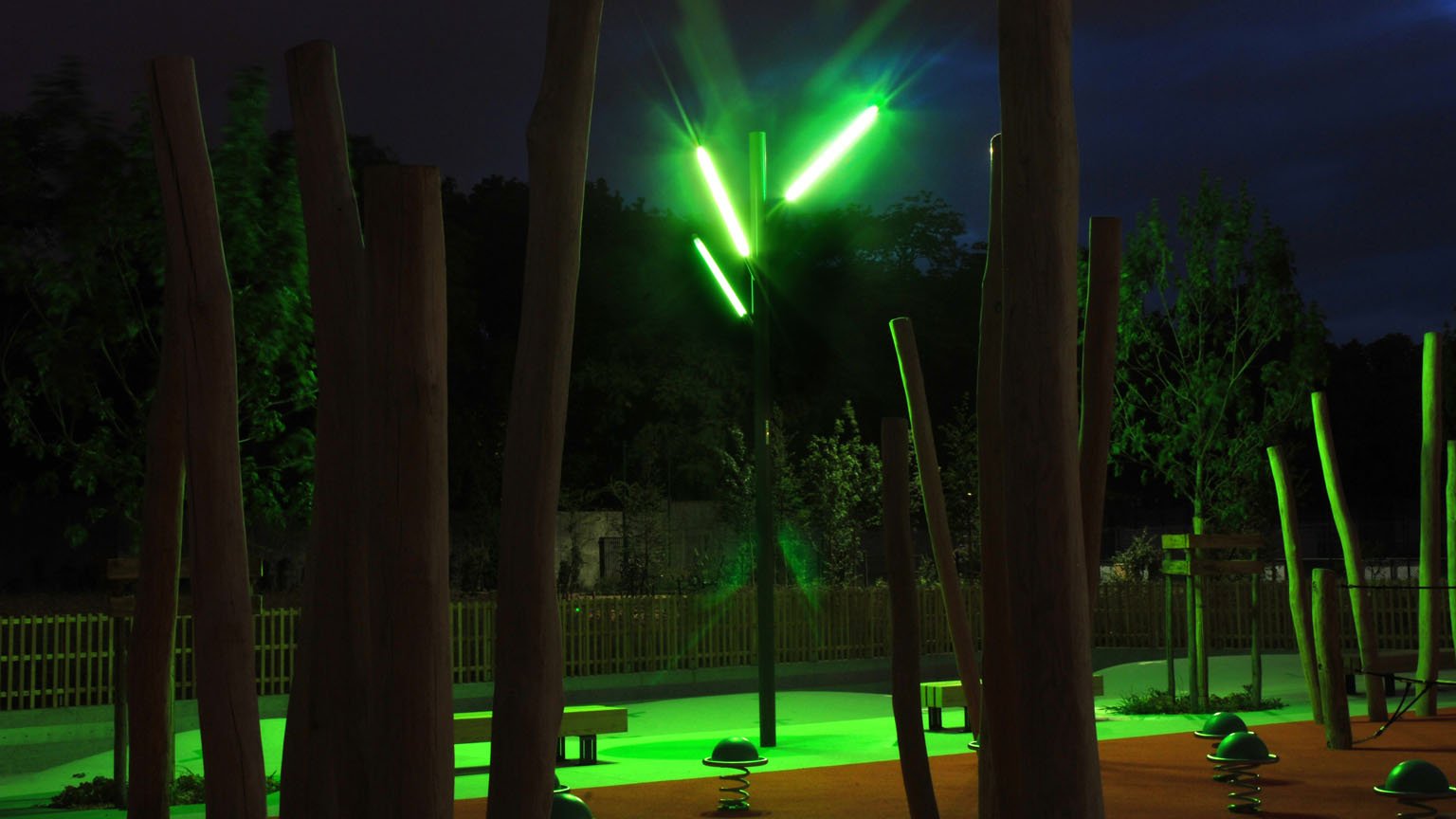Clos Layat park completes the green belt of Lyon. Built in a former wasteland, the park is designed as an island of greenness dedicated to outdoor activities and biodiversity. Our discreet lighting preserves the ecological vocation of the park as well as accompanying its sporting activities : green LED solar lighting along the running track marks the way, motion sensors are integrated in the undergrowth lighting fixtures, LED, etc. The kid games are illuminated with an artificial tree made of green fluorescent tubes to attract visitors from the street. The project was awarded for its environmental quality as part of the «Public Spaces and Landscape» prize of CAUE.